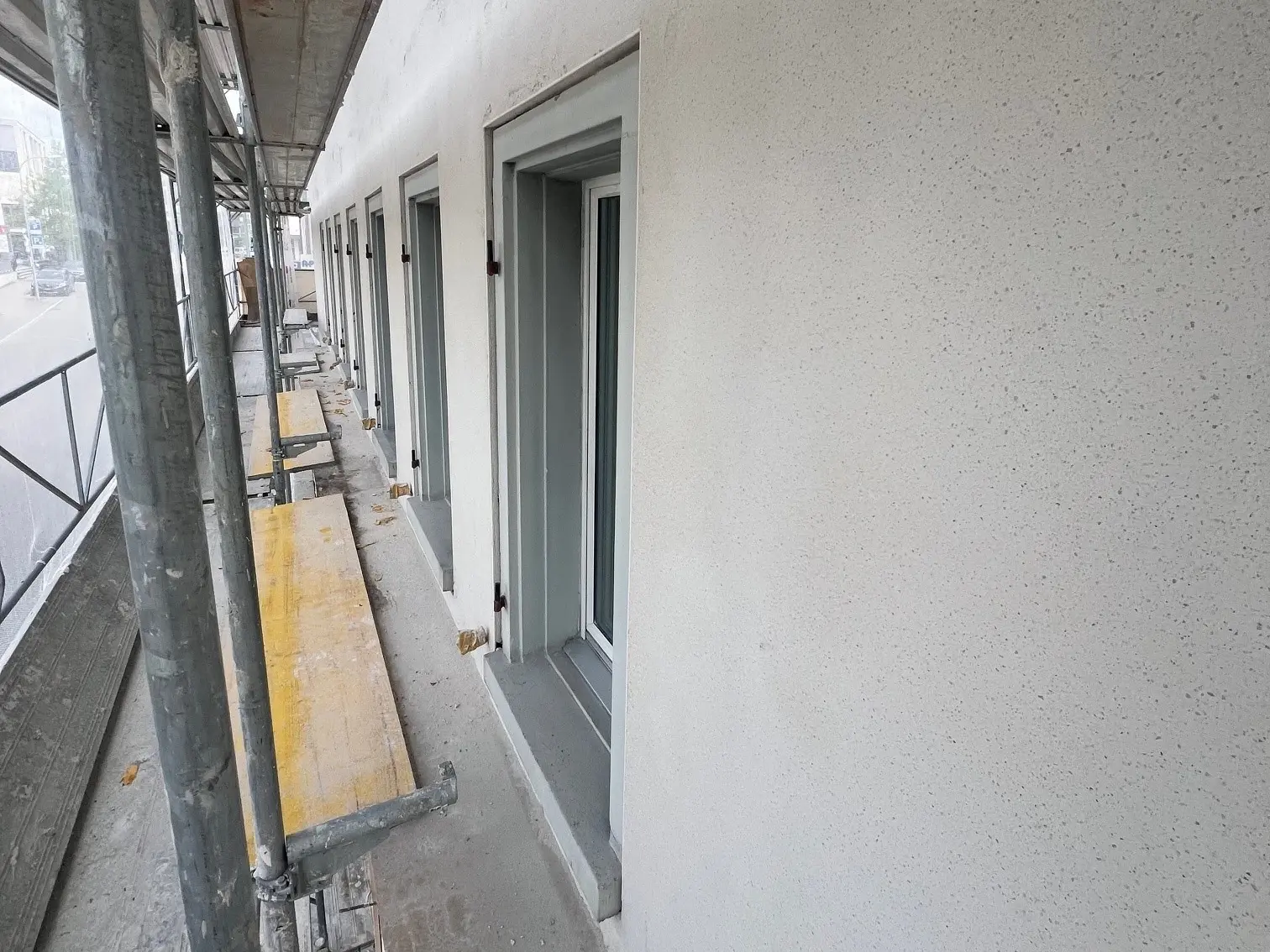 Le bâtiment a été rénové sur le plan énergétique et équipé d'un enduit isolant haute performance Fixit 222 Aerogel – l'épaisseur de la couche est de 4 cm. Comme enduit de finition, on a choisi l'enduit noble Fixit 777 (granulométrie 2,0 mm) sous forme de crépi gratté et peint avec la peinture Fixit 786 Si.