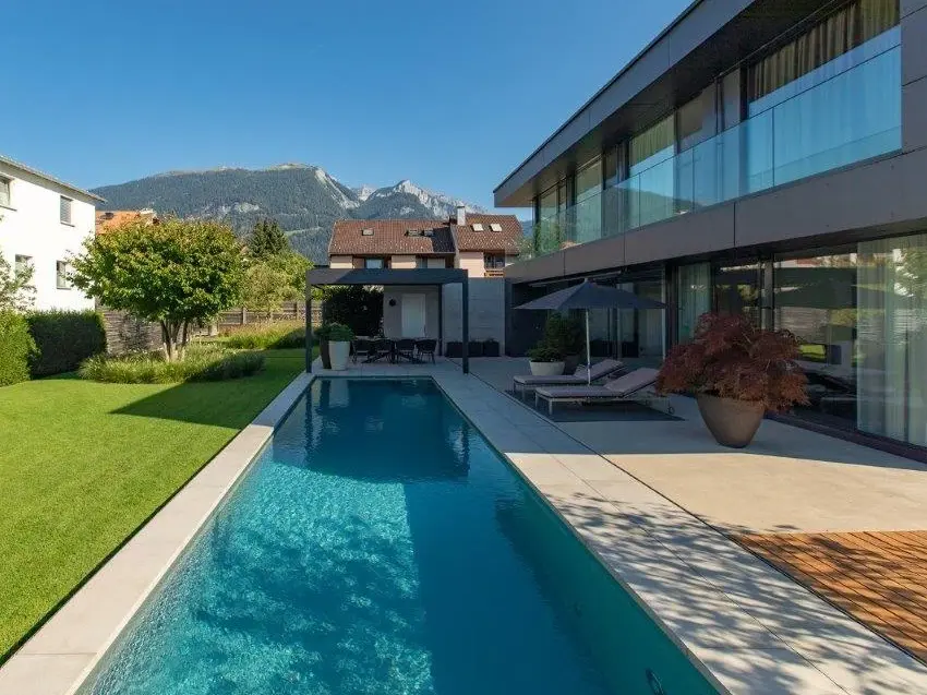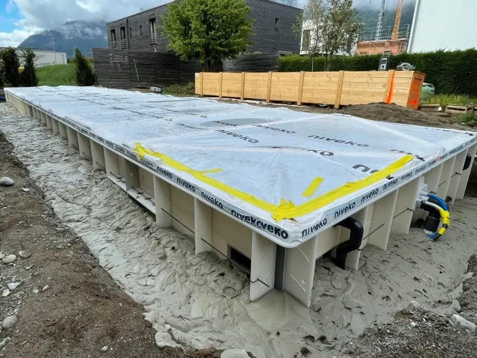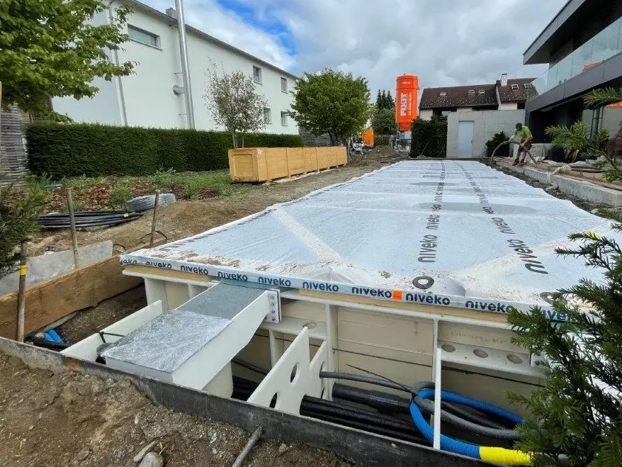 Pour la nouvelle piscine de cette luxueuse maison individuelle, le remblai léger et isolant a été réalisé avec du béton mousse Fixit POR 9030. L’installation a ainsi pu être effectuée rapidement et facilement.