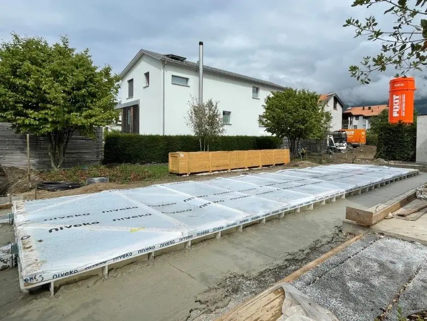 Pour la nouvelle piscine, la dalle de fond, la couronne et le remblai isolant ont été réalisés à l’aide d’une pompe mélangeuse silo efficace et des produits Fixit Beton adaptés. La mise en place du béton mousse Fixit POR 9030 est rapide et facile.