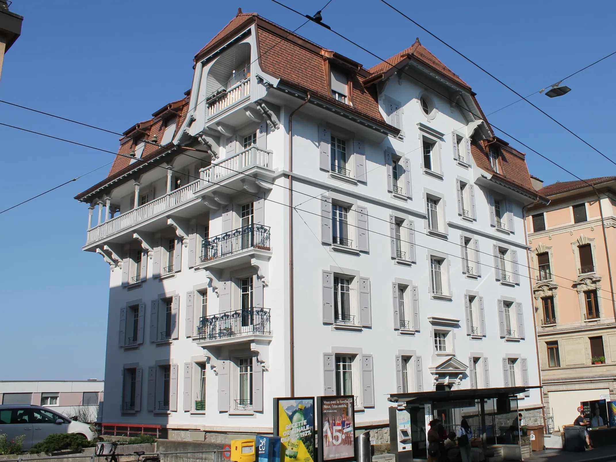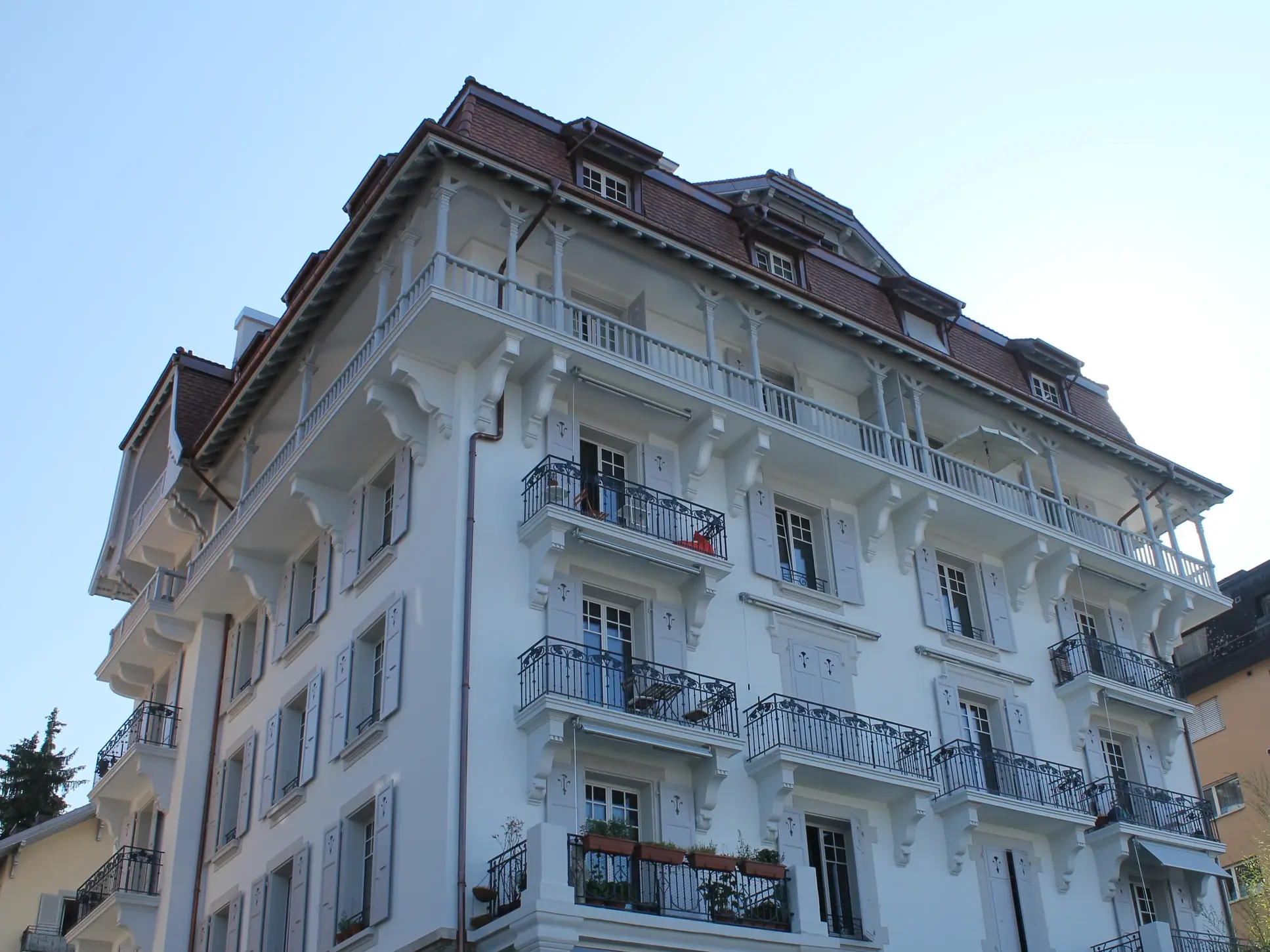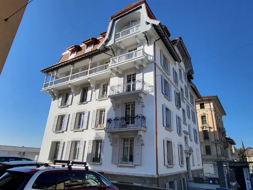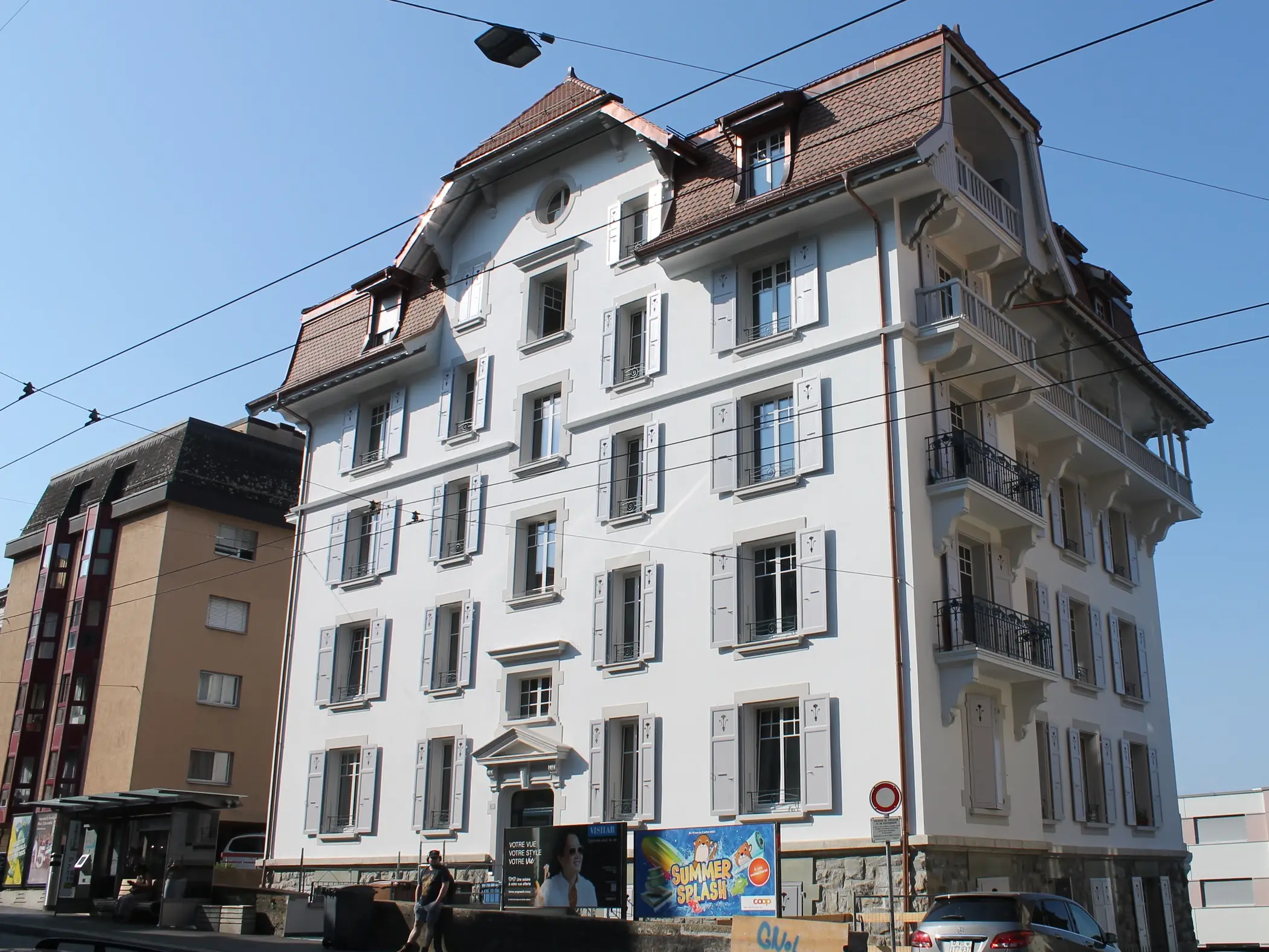 Energetische Sanierung mit dem System Fixit 222 Aerogel Hochleistungsdämmputz mit einer Schichtdicke von 30 mm. So kann eine energetische Sanierung erfolgen, ohne das äussere Erscheinungsbild des Gebäudes zu beeinträchtigen. Der Deckputz wurde mit Fixit 203 Deckputz mit hydraulischem Kalk (Körnung 0–1 mm) und der Farbe Fixit 786 Si Silikat-Silikon-Überrollfarbe in zwei Schichten ausgeführt.