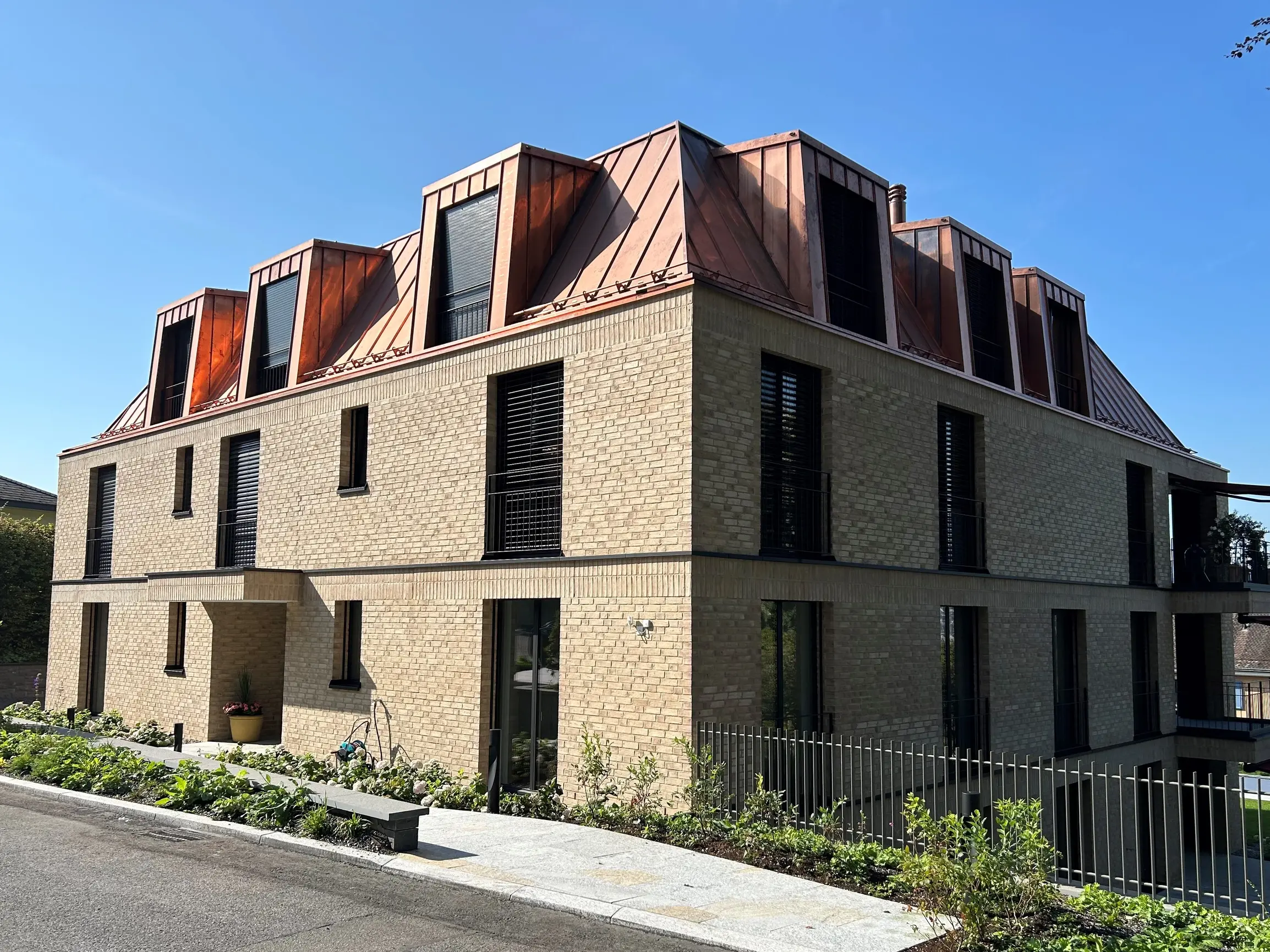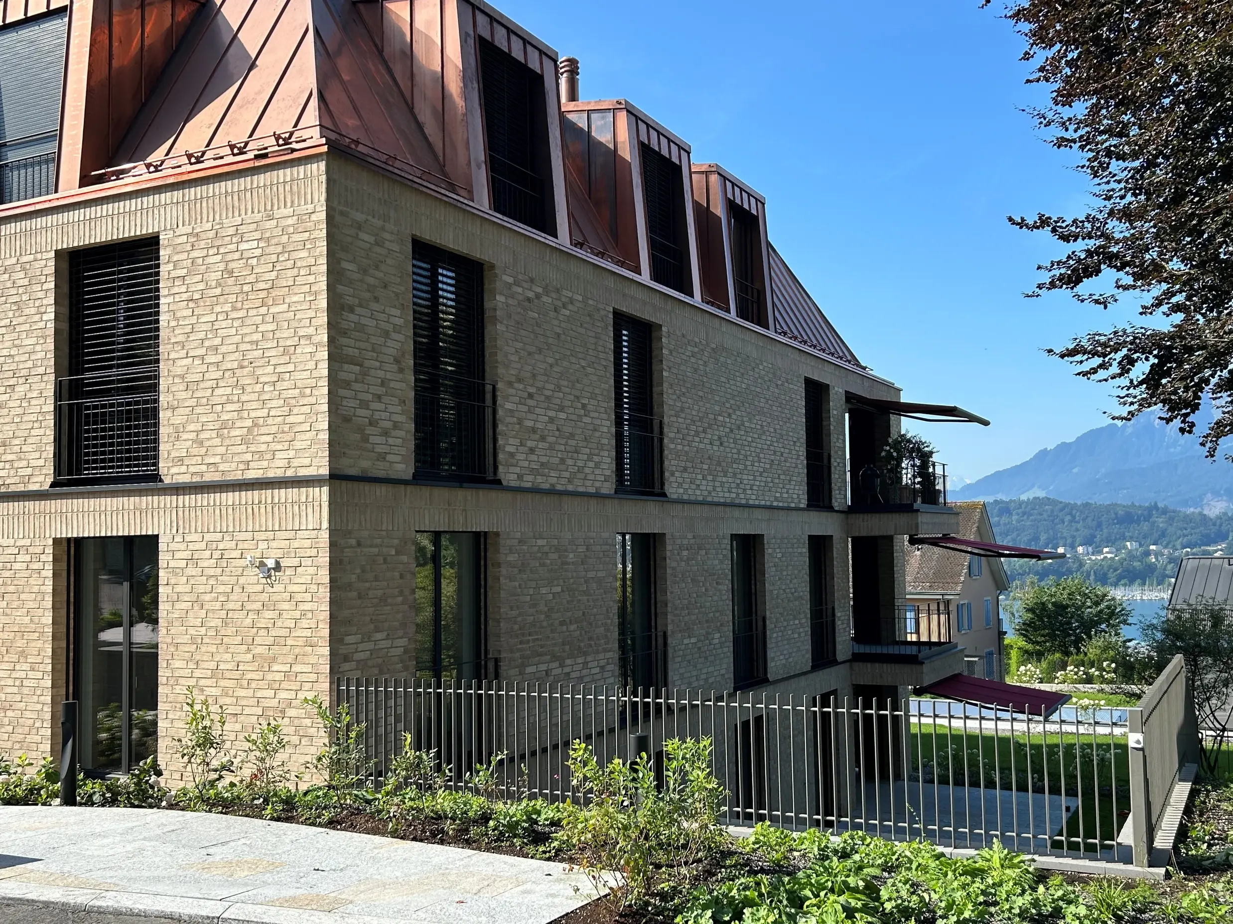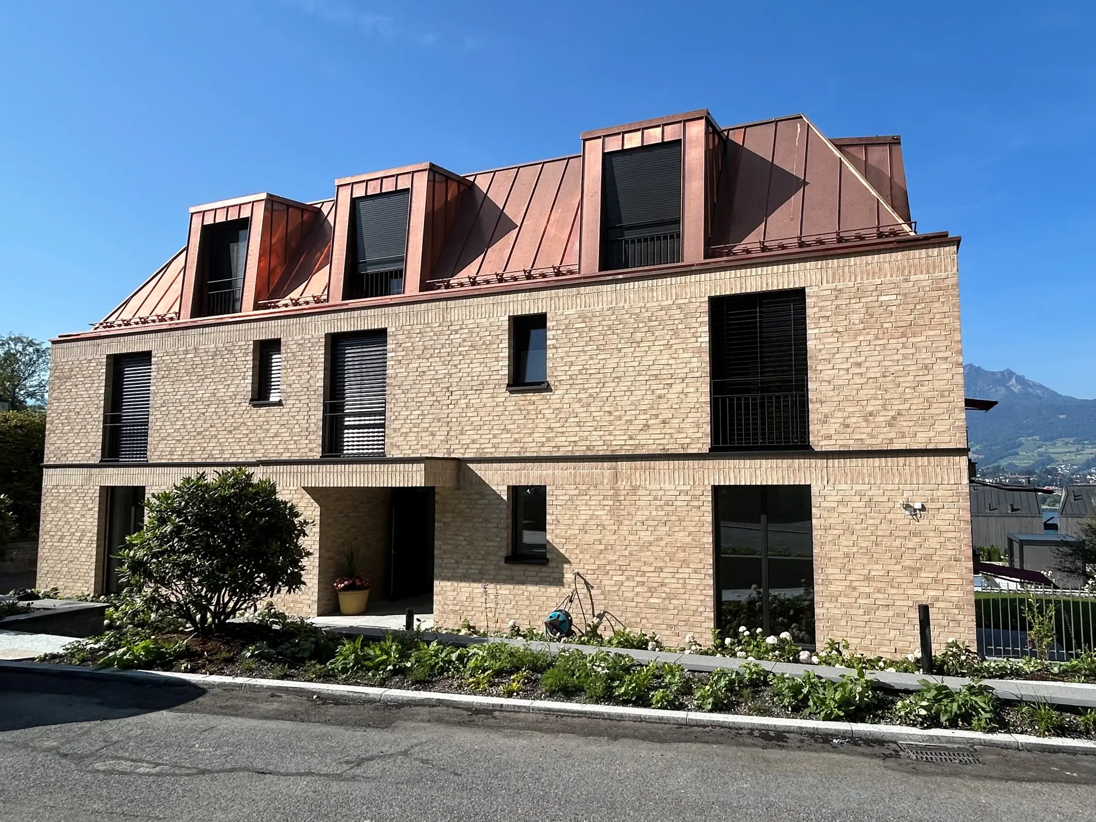 Im begehrten Bellerive-Quartier in Luzern entstand eine elegante Stadtvilla mit gemauerter Klinkerfassade und einem Kupferdach. Fixit durfte den Sichtmörtel Fixit 987 in beigeweiss liefern.