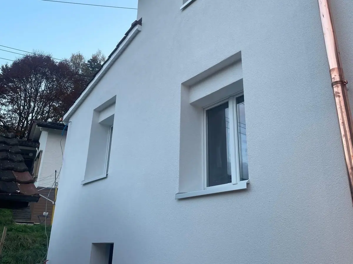 Einfamilienhaus (EFH) mit einem Zweischalenmauerwerk. Die Fassade wurde mit dem Universal Leichtputz Fixit 600 Rapid verputzt und der Deckputz Fixit 777 (3,0 mm Rille) wurde mit dem Schwamm strukturiert. Die Leibungen an der Fassade sind abgerundet und die Dachuntersicht wurde speziell konstruiert und verputzt. Im Innenbereich kam der Fixit 180 evo Innengrundputz zum Einsatz. Als Deckputz an den innenwänden wurde der feine Sumpfkalk Fixit 751 (0,5 mm) in zwei Lagen aufgezogen. Als Deckenweissputz kam der Fixit 166 SL Plus Gips-Maschinenputz mit integrierter Haftbrücke zum Einsatz.
