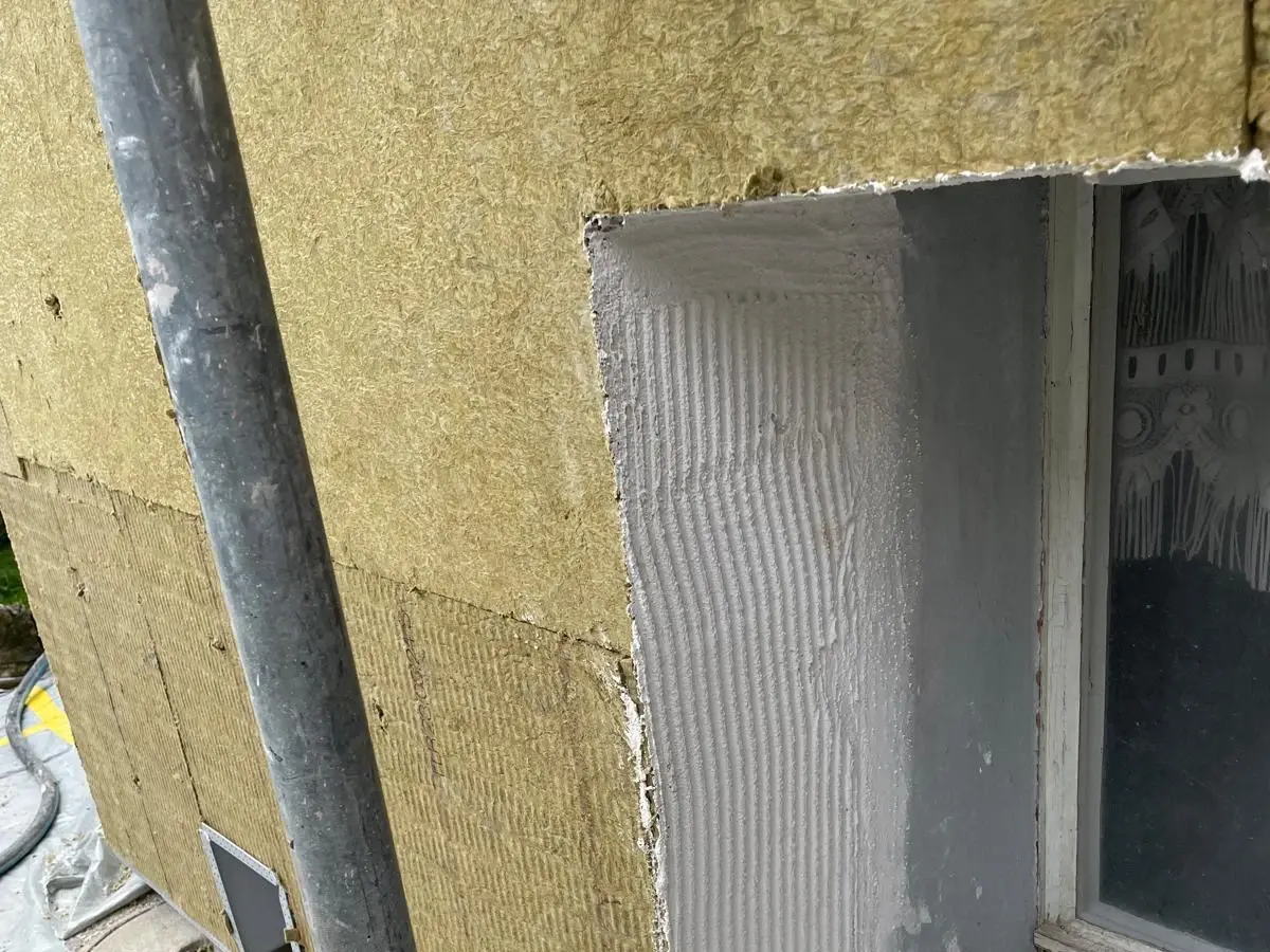 Außenwärmedämmung FIXITtherm.mineral mit Steinwolle-Dämmplatten COMPACT PRO in einer Dicke von 180 mm mit mechanischen Befestigungen. Der Deckputz wurde mit Fixit 740 Si Silikat-Silikonputz aussen in einer Schichtstärke von 2 mm ausgeführt.